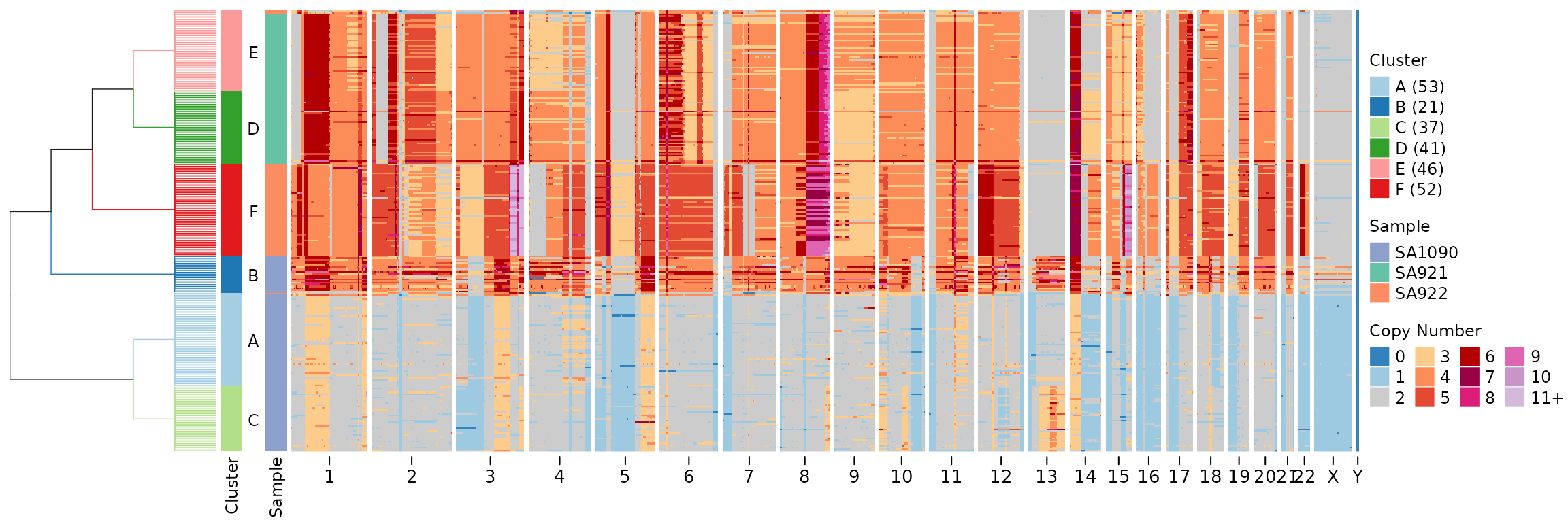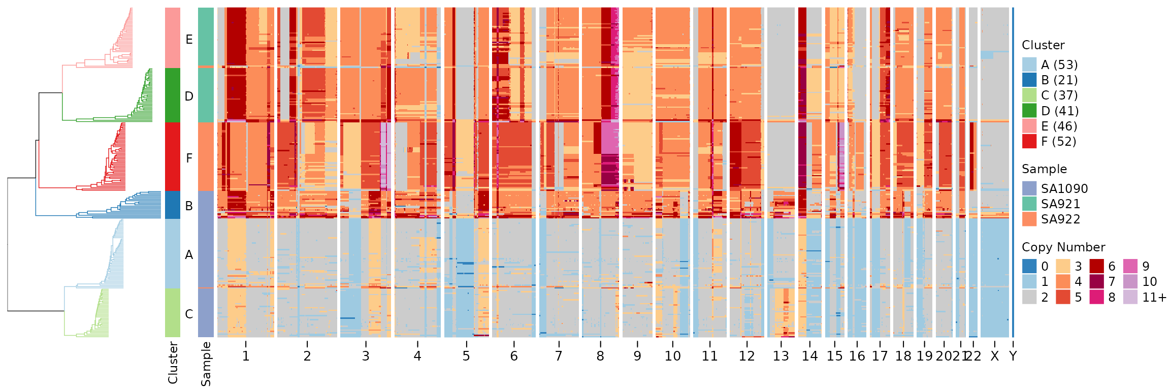 plotHeatmap(CNbins, tree = clustering$tree, clusters = clustering$clustering)